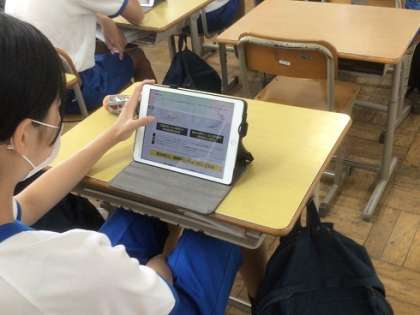 写真は、タブレットに配信された資料を見ながら確認している1年生の様子です。