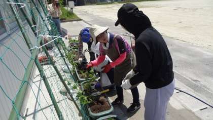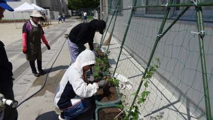 12日(水)に続いて、2回目の活動となりました。ゴーヤやサツマイモの苗を植えます。元気に育ってくれると嬉しいです。ご協力いただいた地域の皆様、保護者ボランティアの皆様、誠にありがとうございました。