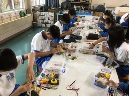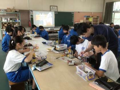 2年生の技術科です。歯車を組み合わせる教材を活用しながら取り組んでいます。エネルギー変換に関する学習になります。