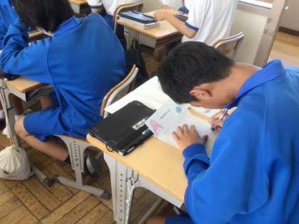 2年生の数学科です。少数や分数の入った連立方程式の計算問題に挑戦です。両辺を何倍かして、整数の式に変えるのがポイントですね。
