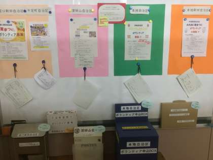 6月19日(水)逢中生ボランティア募集中! 公開日 2024/06/20 更新日 2024/06/20 地域学校共働本部 職員室の反対側に設置されている地域学校共働本部の掲示板です。 各自治区主催のサマーフェスタや夏まつりにおけるボランティア募集の案内が、掲示されています。どのイベントもとても楽しそうです。逢中生の手で、身近な自治区の夏のイベントをぜひ盛り上げていきましょう。
