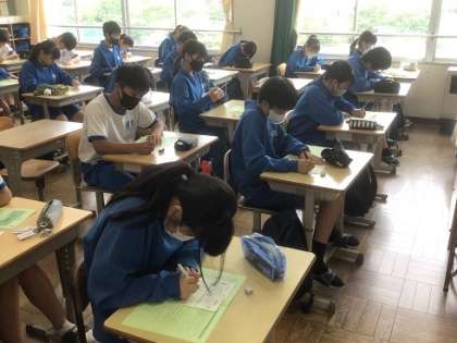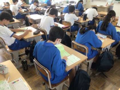 豊田市では、全小中学校で「hyper-QU(ハイパーキューユー)」と呼ばれるアンケート方式の検査を年2回実施しています。児童生徒の学校への満足度や意欲等をとらえ、子どもたちにとってよりよい学校生活を実現していくための資料の一つとしています(写真は、6/20に実施した様子です)。