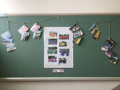 3年生の掲示板です。生徒作成の掲示物が飾られています。体育祭の写真を上手くアレンジしながらまとめられています。体育祭当日の様子が、生き生きと伝わってきます。