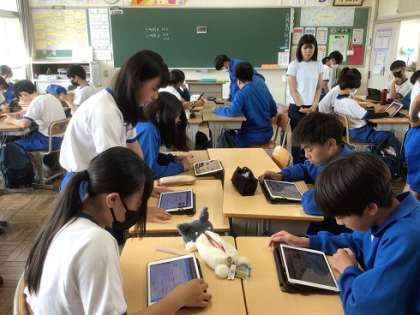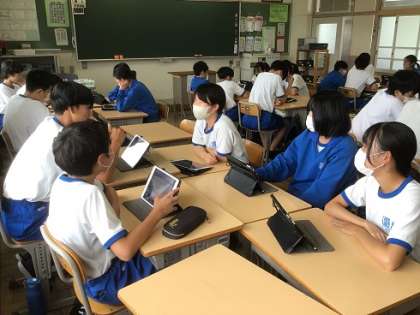 2年生です。学習用タブレットを活用し、インターネット等で職業について調べて、それをまとめています。写真は、班の中で発表し合っている様子です。自分の将来や生き方を考えるキャリア教育の一環として行っています。