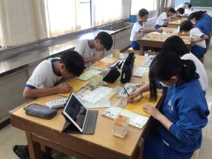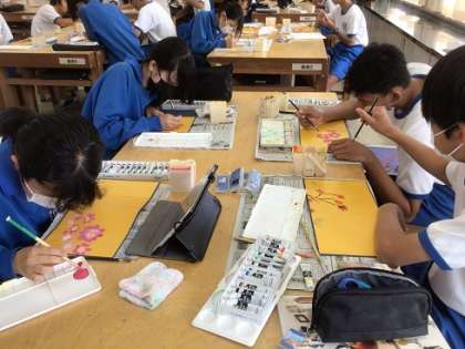 3年生の美術科です。屏風絵に挑戦です。四季をテーマに、色や筆の使い方を工夫しながら、それぞれの作品に集中して取り組んでいました。