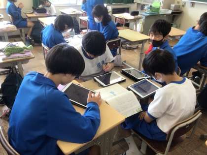 2年生の国語科です。資料をもとに、タブレットを活用しながら説明文を作っています。自分の考えをまとめて、伝えることは、これからも必要な力となっていくはずです。