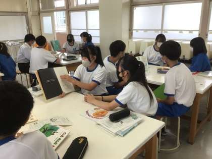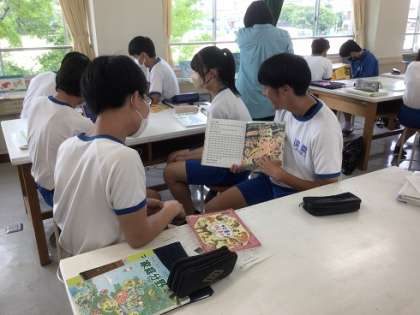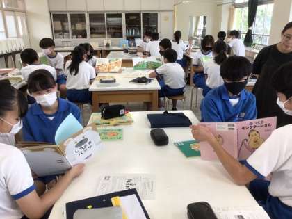 3年生の家庭科です。幼児を対象に想定して、絵本の読み聞かせを練習しています。それぞれ工夫をしながら取り組んでいました。絵本の用意などは、図書館司書の方に協力をいただいています。
