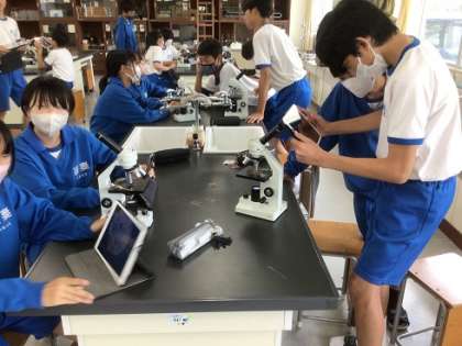 2年生の理科です。顕微鏡を使って、細胞の観察をしていました。観察した細胞をタブレットで写真撮影しようとがんばっています。