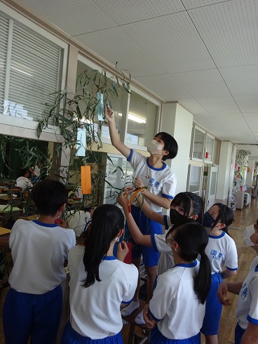 もうすぐ七夕です。飾りつけをしている学級や学年がありました。願い事が叶うとよいですね。写真は3年生です。