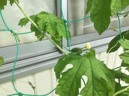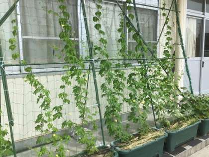 保護者ボランティアの方々が設置していただいた「緑のカーテン」の植物がぐんぐん成長しています。小さなゴーヤが実り始めていました。