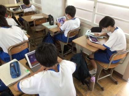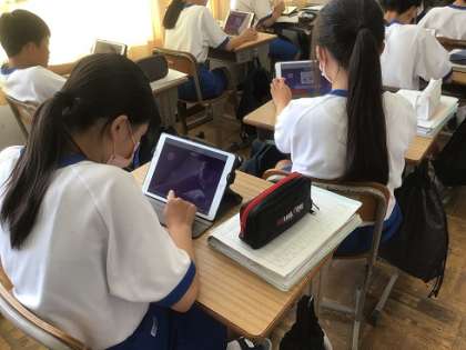 1年生の数学科です。学習用タブレットを活用し、ゲーム形式で文字式の計算の学習を進めています。