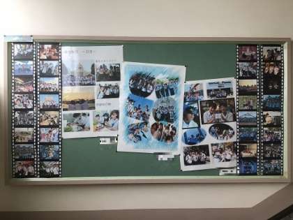 3年生の掲示板です。生徒作成の掲示物が飾られています。修学旅行のスナップ写真を活用し、アイデアを生かしながらまとめられています。修学旅行の楽しい様子が、とてもよく伝わってきます。