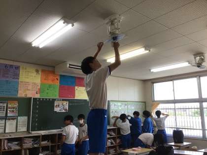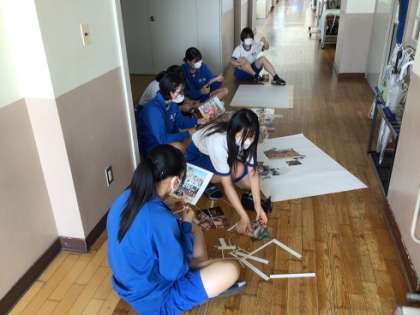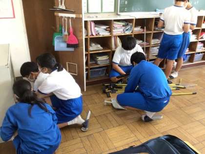 3年生のあるクラスです。夏休み直前ということで、教室内の整理整頓や掃除を行っていました。廊下では、写真を使った掲示物づくりをしています。