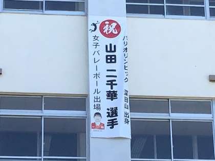 バレーボール女子日本代表チームの山田二千華(やまだ にちか)選手は、逢妻中学校の卒業生です。地区で作成いただいた、山田選手の応援垂れ幕を校舎に飾りました。