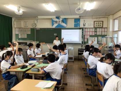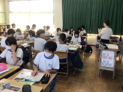 3年生の英語科です。既習の単語知識や文法知識を使って、英文を読みながら理解を進めていきます。