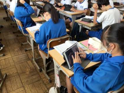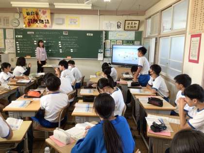 2年生の道徳科です。話し合いをしながら、法やきまりの意義について考え合っています。