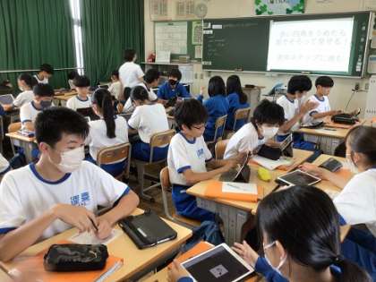 2年生の英語科です。学習用タブレットで留守番電話のメッセージを聞き、グループで内容を理解することを通して、必要な情報を踏まえたメールの返信を書きます。