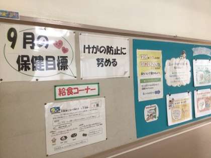 9月の保健目標は「けがの防止に努める」です。校内はもちろん、校外でも安全な生活、危険を予測した判断ができるように心がけていきましょう。
