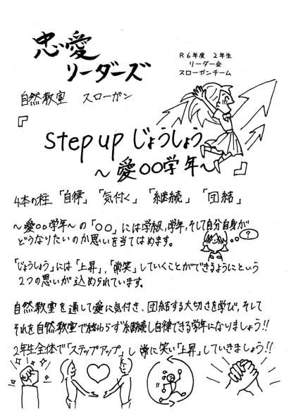 9月13日(金)自然教室まであと4日2 公開日 2024/09/14 更新日 2024/09/14 学校行事 自然教室のスローガンは、「Step up じょうしょう 〜愛〇〇学年〜」です。2年生全体が、そして一人一人が成長する姿がとても楽しみです。