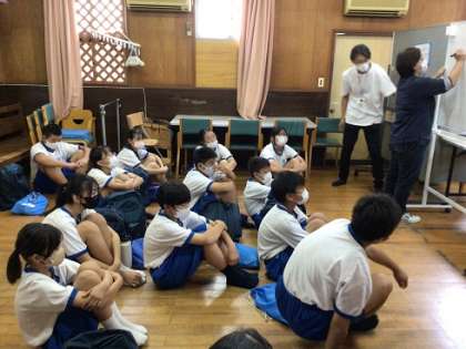 1年生は、総合的な学習の時間で、福祉についての学習を進めています。今日は1つの学級が、学区にある福祉関連の事業所等を訪問しました。