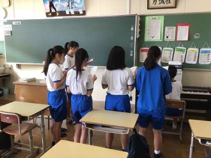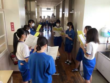 登校後の合唱練習の様子です。それぞれのクラスで、熱心に取り組んでいました。朝から歌声に包まれている逢中です。写真は2年生です。