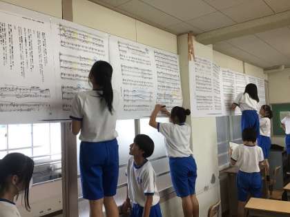 2年生です。拡大して掲示した楽譜に、音楽記号や合唱のポイントなどを書き込んでいます。これからの練習で、とても役立ちそうですね。