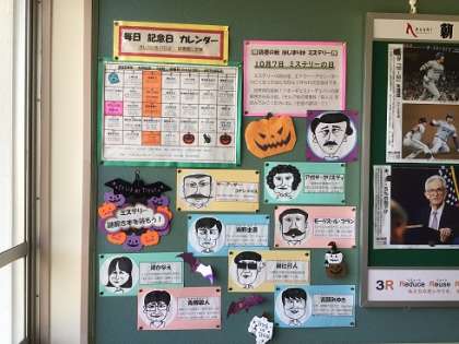 本館東階段の2階と3階の踊り場に、図書館司書の方が作成していただいている掲示版があります。10月の記念日カレンダーや最近のニュースなど、ためになる内容がたくさん載っています。