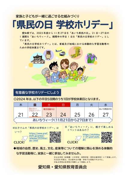 愛知県では、2023年度から11月27日を「あいち県民の日」、21日〜27日の1週間を「あいちウィーク」、期間中の平日 1 日を「県民の日学校ホリデー」としています。