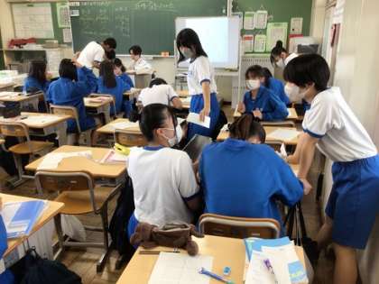 2年生の数学科です。一次関数について学習を進めています。教育実習の先生も参加しています。生徒は、友だちに教えてもらったり、教えたりしながら取り組んでいました。