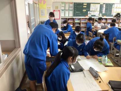 2年生の社会科です。近畿地方について、ニュースのアナウンサーになった想定での紹介原稿を作成しています。地方の特色や変化などについての学びにつながっていきます。