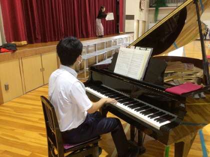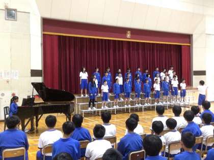 上が7組「風が吹いている」です。下の写真は、ある担任の先生が伴奏をして「翼をください」を合唱している様子です。この先生は音楽の先生ではないのですが、すばらしい演奏を聴かせてくれました。