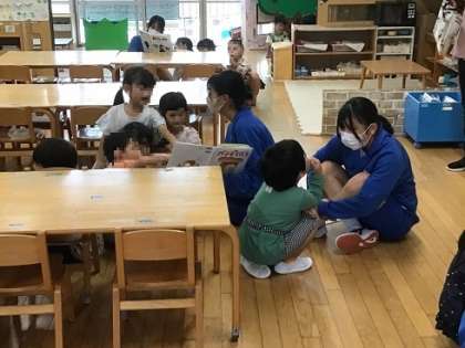 学区のこども園にご協力いただき、家庭科の学習として、3年生がこども園実習を行いました。こども園を訪問し、園庭でいっしょに遊んだり、室内で絵本の読み聞かせをしたりしました。