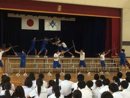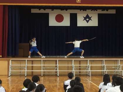 3年生が、総合的な学習の時間で取り組んでいる「誇れる逢妻の実践〜未来へつなぐ逢妻2030プラン〜」の一つとして、地域の伝統文化である棒の手に取り組んでいるグループの発表です。真剣な姿に、他の3年生も見入っていました。