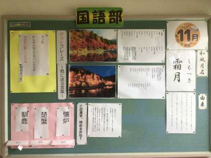 11月1日(金)校内掲示板 公開日 2024/11/02 更新日 2024/11/02 お知らせ 東階段にある国語科の掲示板です。11月(霜月)について様々な知識が紹介されています。まだ見ていない人は、ぜひじっくりと見てみましょう。