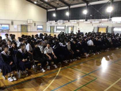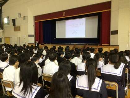 1年生が、体育館で学校保健集会を開催しました。テーマは、「スマホ・ゲームが脳に与える影響」〜脳と心を守るために〜 です。学校薬剤師の方を講師にお招きし、スマホが脳に与える影響やスマホ依存症について学びました。集会の最後には、積極的に質問する生徒もいました。