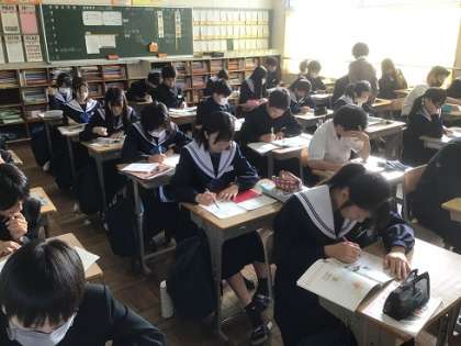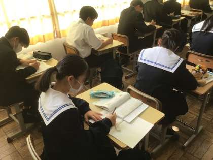 後期中間テストの最終日となりました。写真はテスト開始前の2年生です。土日は十分な学習ができましたか?最後まで粘り強く取り組んでいきましょう。