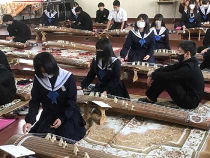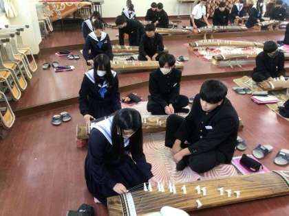 3年生の音楽科です。日本古来の楽器である「琴」の演奏に挑戦です。姿勢にも気をつけながら、きれいな音色を響かせていました。