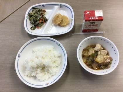 今日の献立は、ごはん、すきやき風煮、海藻サラダ、たらナゲットでした。
