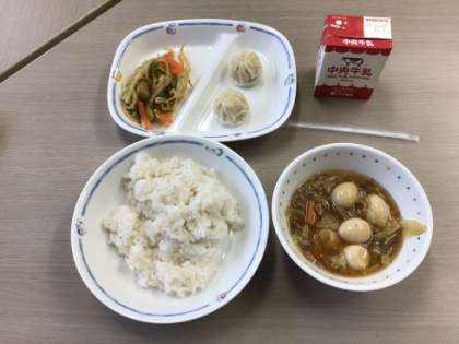 今日の献立は、麦ごはん、中華飯、ナムル、ショウロンポウでした。