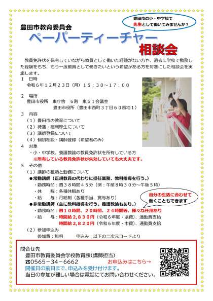教員免許状を保有していながら教員として働いた経験がない方や、過去に学校で勤務した経験をもち、もう一度教員として働きたいという希望がある方を対象とした相談会を豊田市教育委員会が実施します。