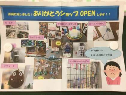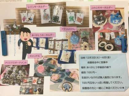 12月2日(月)「ありがとうショップ」にお越しください 公開日 2024/12/02 更新日 2024/12/02 お知らせ ありがとう学級の生徒たちが制作したグッズを販売する「ありがとうショップ」を個別懇談会の日程(12/3火〜6金)にあわせて開店します。 アイロンビーズ、キーホルダ、コースターなど、いろいろな小物を販売しています。今回は新作も用意してくれています。どれも手作りのあたたかい作品です。ぜひお立ち寄りください。