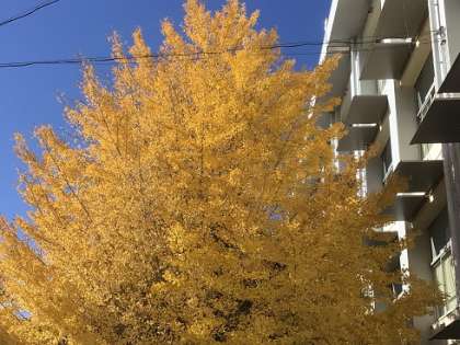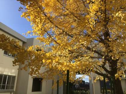 校内のイチョウの木です。青空の色と黄色のコントラストが、とてもきれいです。
