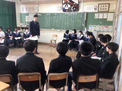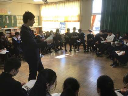 2年生の道徳科です。いつもとは違う座席配置にして、互いの顔を見ながら意見交換をしています。