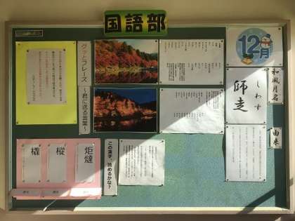 12月6日(金)校内掲示板 公開日 2024/12/06 更新日 2024/12/06 お知らせ 東階段にある国語科の掲示板です。12月(師走)について様々な知識が紹介されています。まだ見ていない人は、ぜひじっくりと見てみましょう。