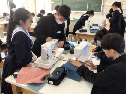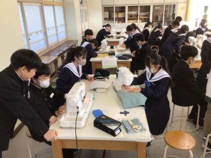 1年生の家庭科です。ボックスティッシュのカバーを制作しています。ミシンを使った作業は難しいけれど、みんながんばっていましたね。
