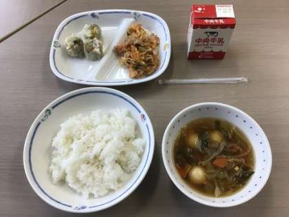 今日の献立にある「キムチチャーハン」が、今回の「たべまる給食」です。あと、五目スープ、野菜入りしゅうまいが出ました。