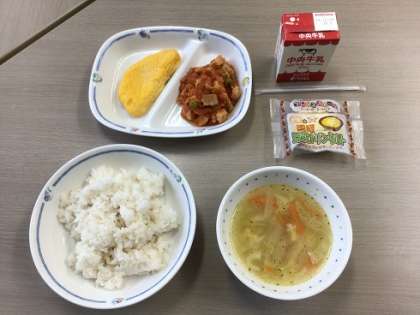 今年最後の給食は、クリスマスにちなんだ献立となりました。チキンライス、パスタスープ、オムレツ、豆乳プリンタルトが出ました。
