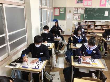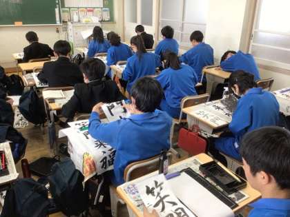写真は2年生です。題字は「笑門来福」です。書き初めらしい静かな雰囲気のなか、新しい年にかける思いをこめて筆を走らせていました。