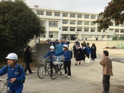 下校時における交差点等での混雑防止や交通安全確保のため、学年ごとに時間差で校門を出るよう、試行的に一斉下校を行っています。