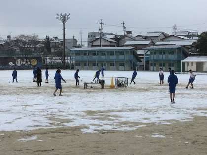 1年生の保健体育科です。まだ雪がうっすら残る運動場でしたが、元気にサッカーの練習をしていました。